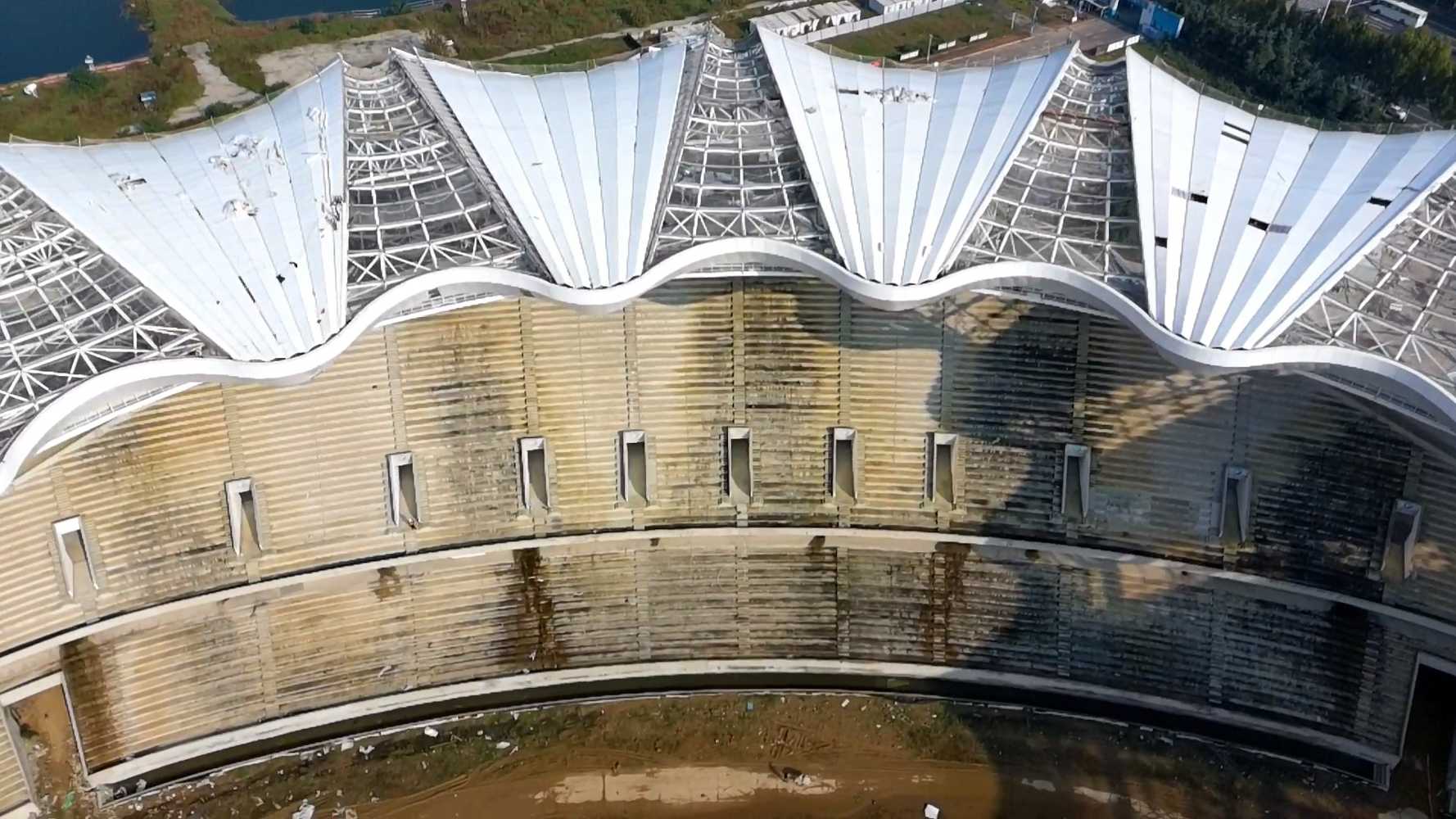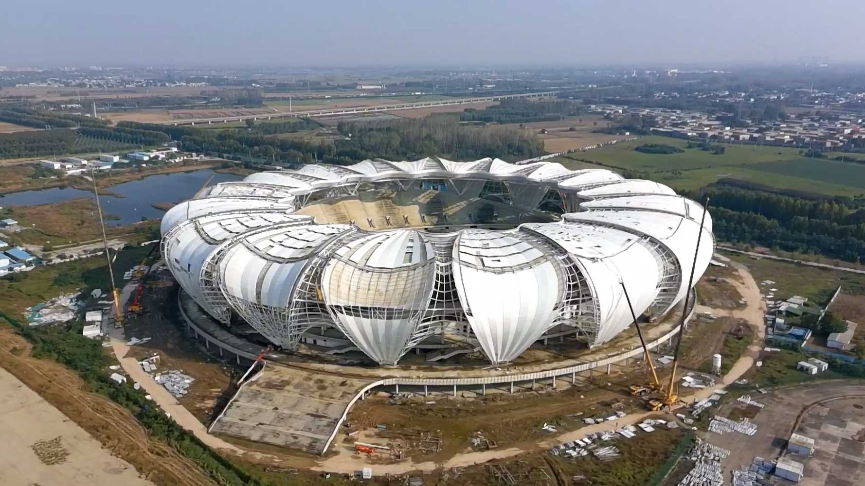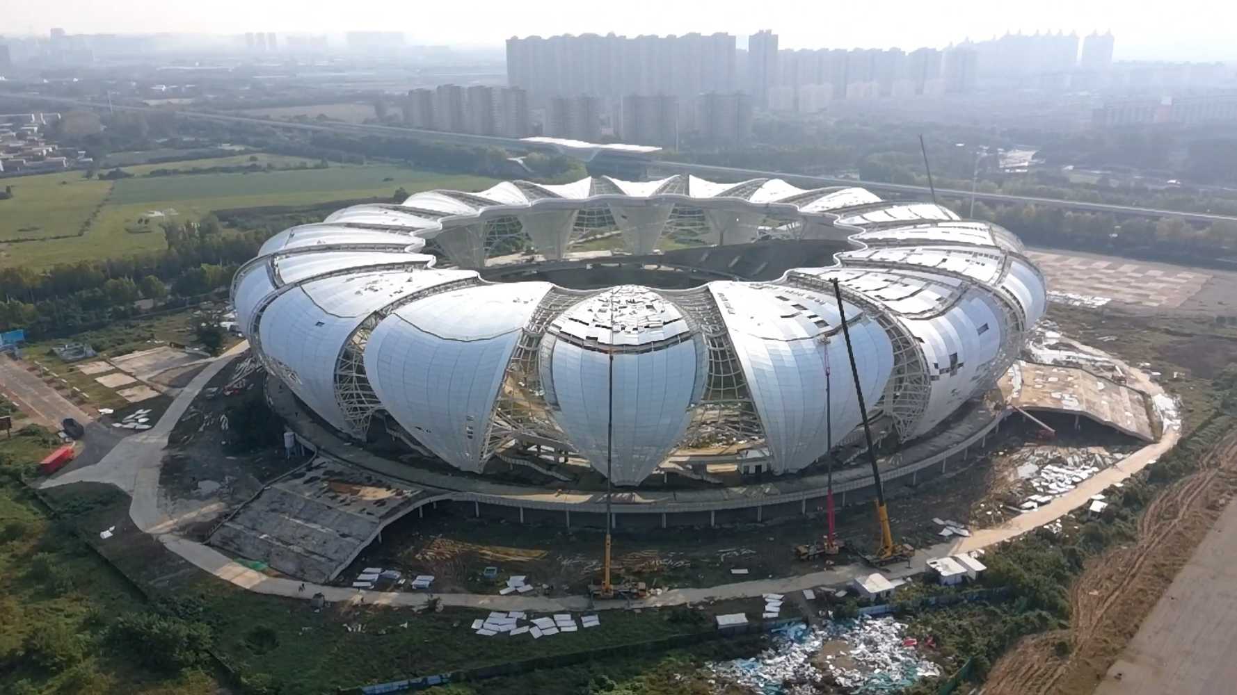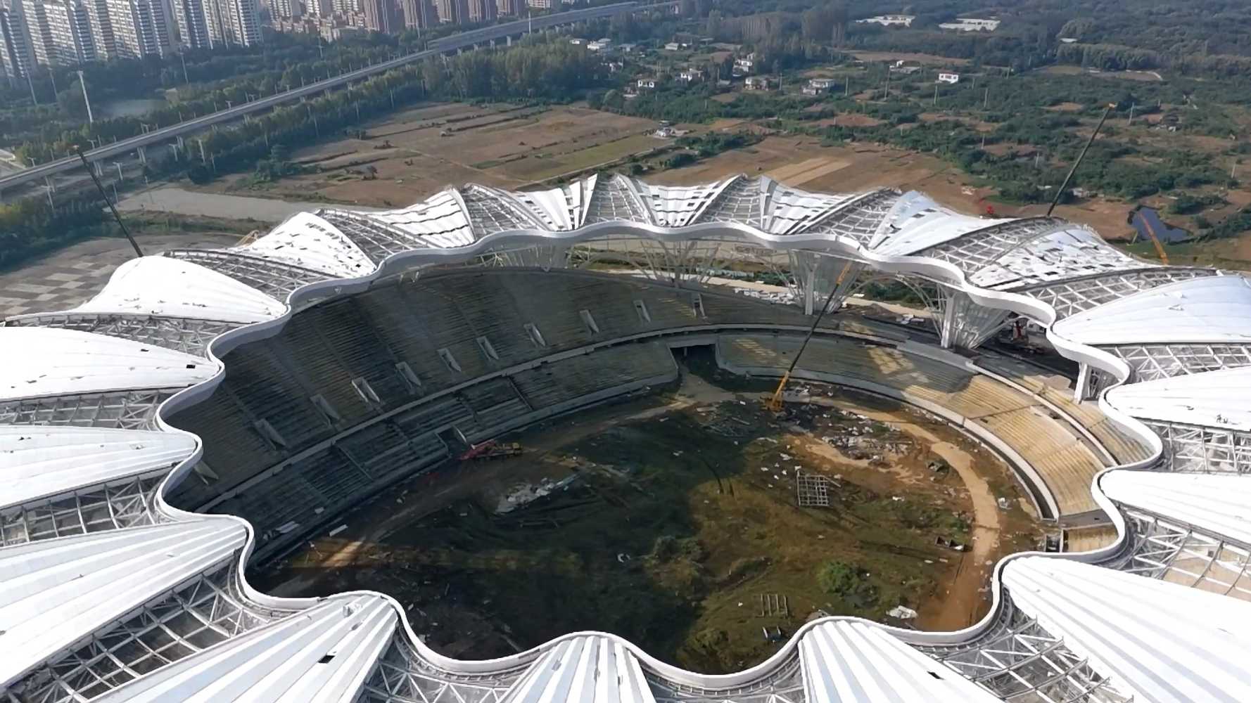 The actual construction of the stadium started in May 2020 and the four-part building in April 2021. The construction cost of the entire complex has risen to 3.45 billion yuan. The contractor was the China Construction Seventh Bureau. The stadium was supposed to be ready by the end of 2023, but work was halted in the middle of that year.