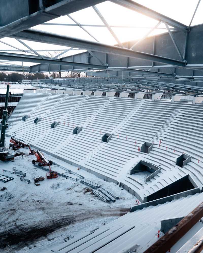 The project is inspired by the forested surroundings of the stadium. Its distinctive feature will be a unique façade composed of tilted reinforced-concrete columns combined with decorative wooden slats. The redevelopment will preserve two sports halls from the old stadium, which used to adjoin the main stand.