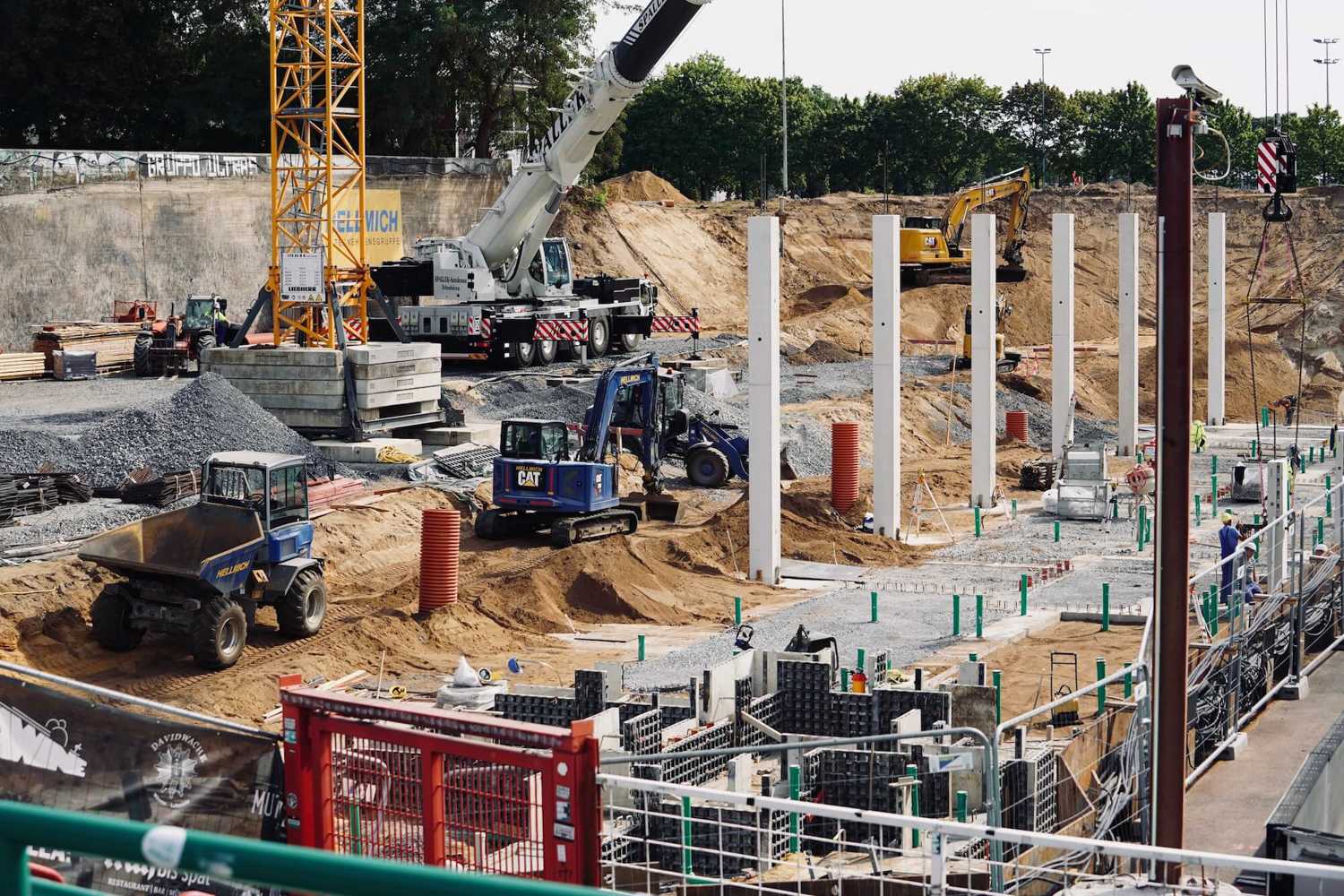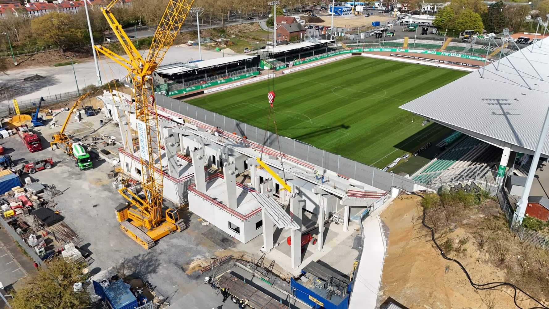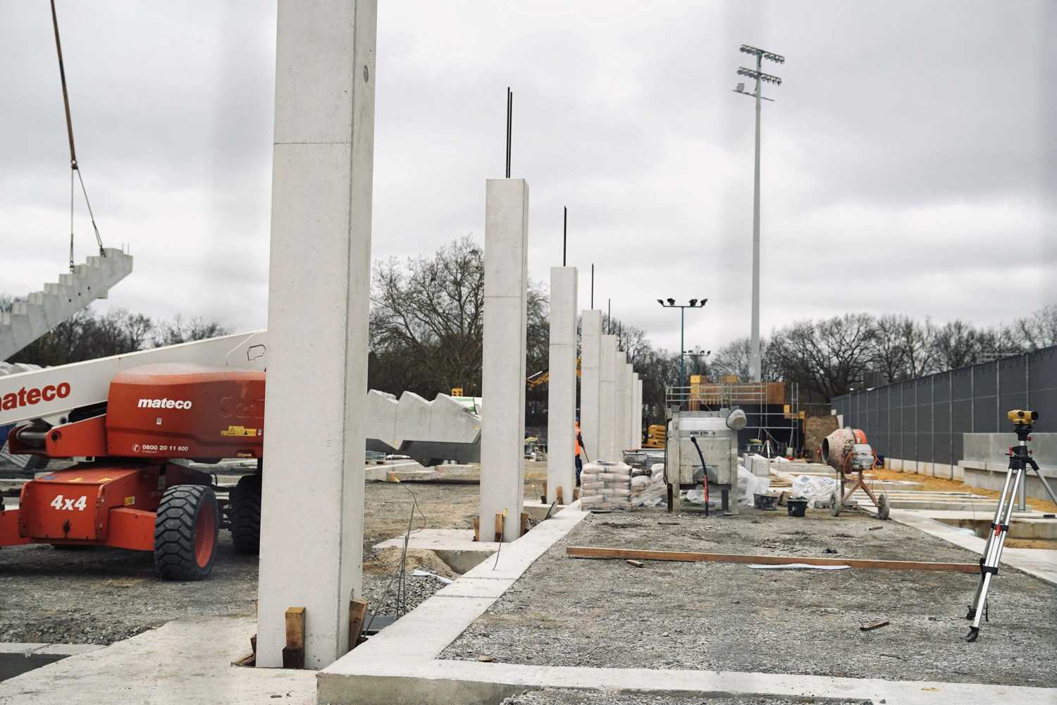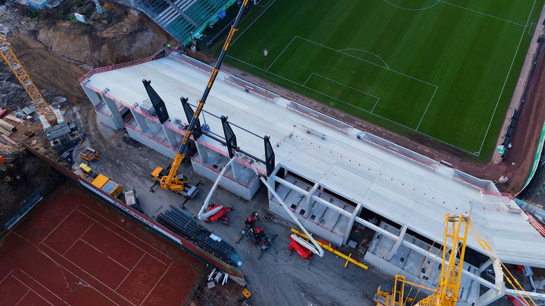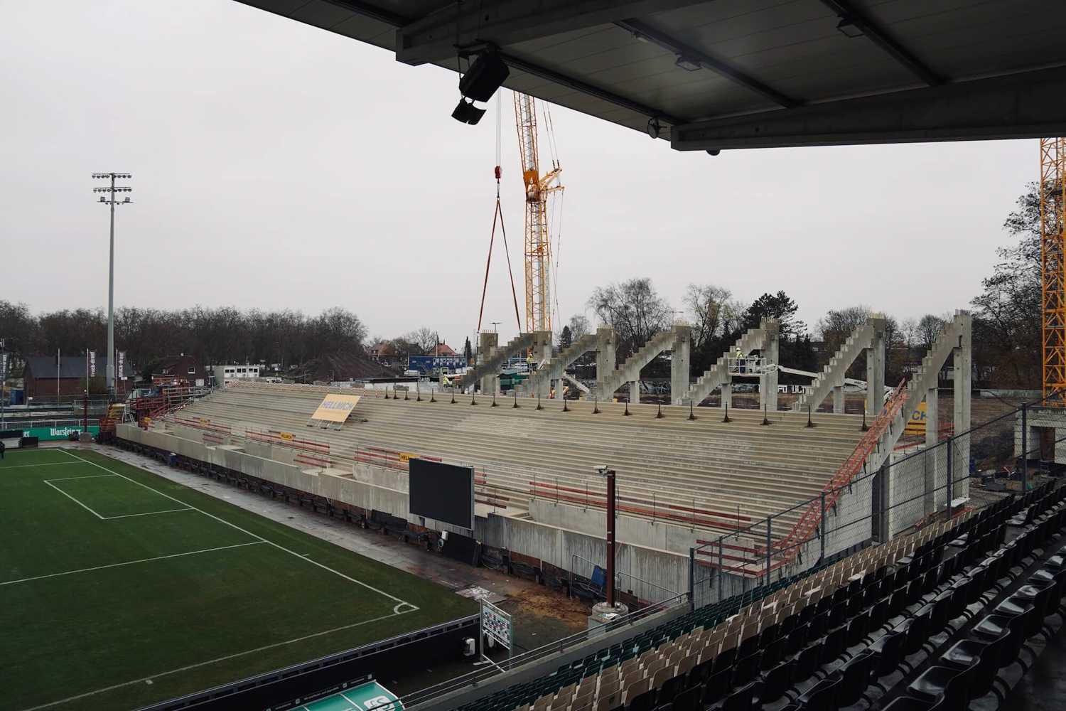 The redevelopment was symbolically inaugurated in June 2022, after which the western stand was dismantled over the following months. The main contractor, however, was only selected in 2024, and the main construction phase began in early 2025.