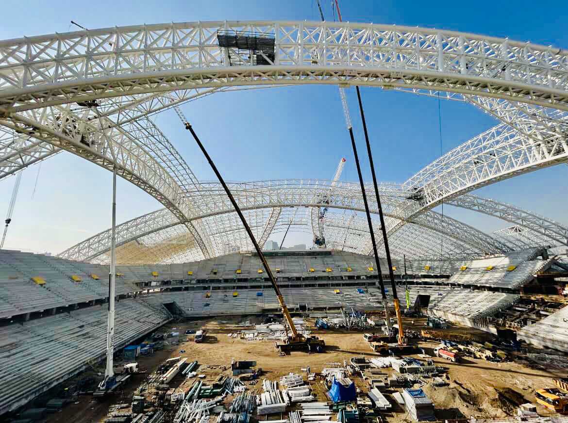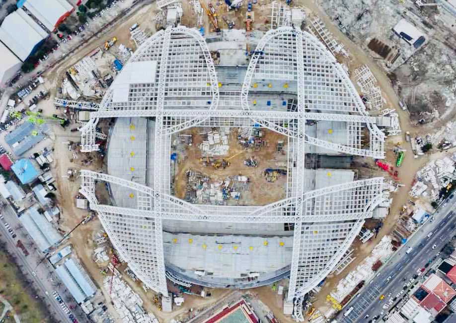 The distinctive dome will be supported by four huge arch trusses. Two of them (the ones running along the pitch) will span 285 meters and will be among the largest used in stadiums around the world.