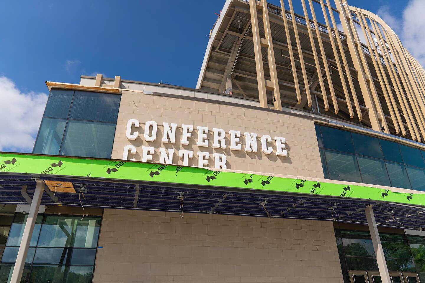 The plan also includes the construction of a conference center behind the north stand, the expansion of the corner Anderson Family Football Complex, and the development of the area behind the east stand, where new buildings with student housing and a hotel are planned, along with a large public plaza.