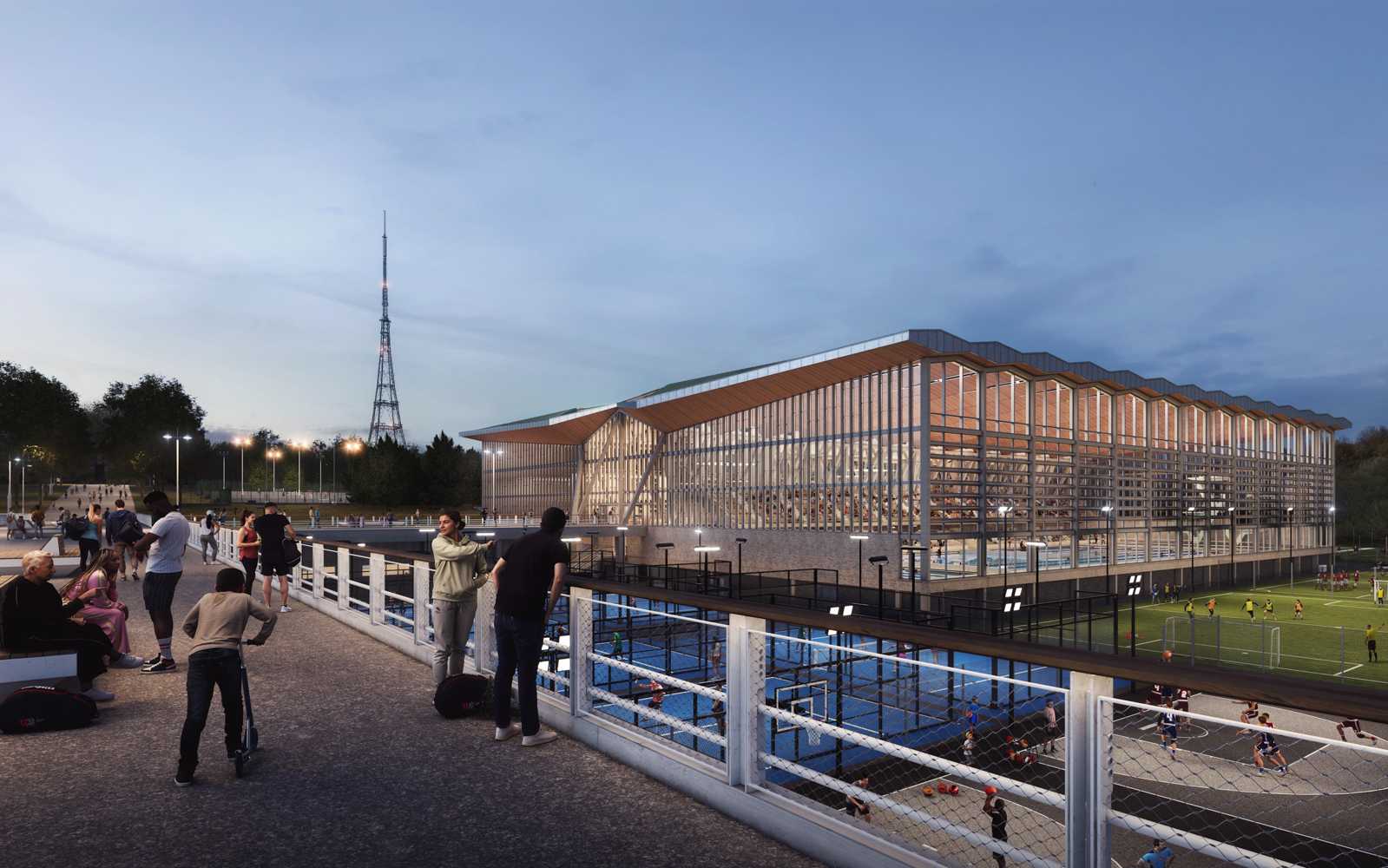 Additional courts and pitches are planned for the surrounding areas. The project also includes a number of sustainability measures, such as photovoltaic panels and a heat pump system.