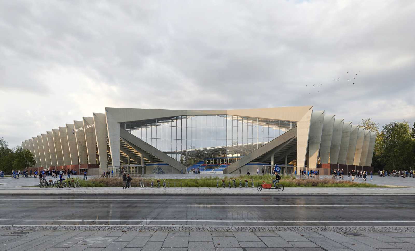 The ribbed roof structure is inspired by shipbuilding, highlighting the stadium’s connection to the city’s identity.