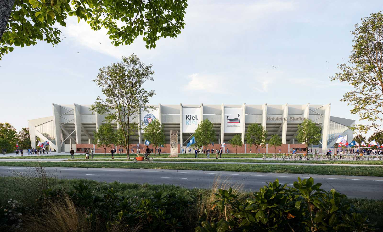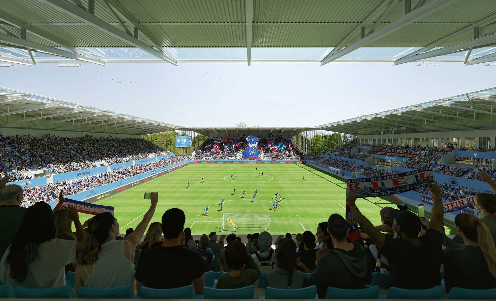 The plan envisions a complete, staged redevelopment of the stadium, resulting in an almost entirely new venue with a capacity of 22,087 spectators, of which 44% will be standing areas. The pitch will be shifted slightly westward by just under 7.5 meters. The project will also require the demolition of the adjacent Holstein-Halle.