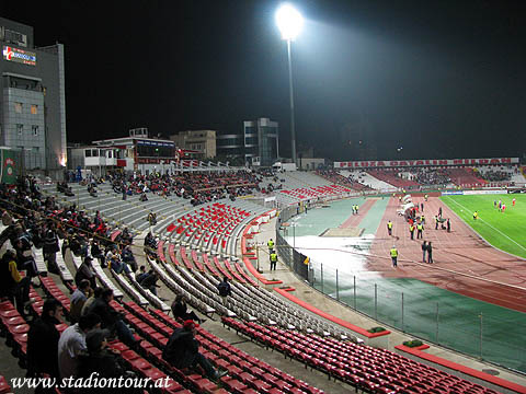 The stadium featured an athletics track surrounded by oval-shaped stands, which were higher on the western side. The venue underwent renovations in the early 21st century, but its condition increasingly fell short of modern standards. After the installation of seating, the stadium had a capacity of approximately 15,000 spectators. The stadium was also equipped with floodlight masts.