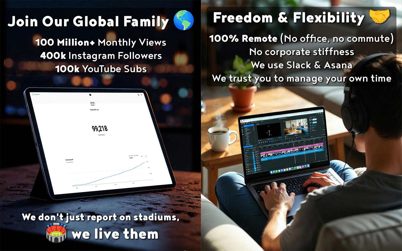 We are a team of stadium enthusiasts. We don't just report on arenas; we live them. We travel the world, photograph architecture, and share our passion with a massive global audience. Our content generates over 100 million views monthly across all platforms, with nearly 400k followers on Instagram and a main YouTube channel rapidly approaching 100k subscribers.