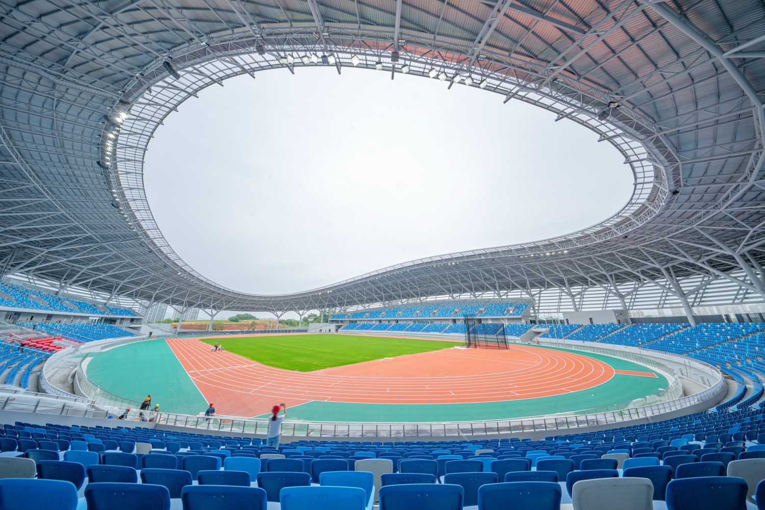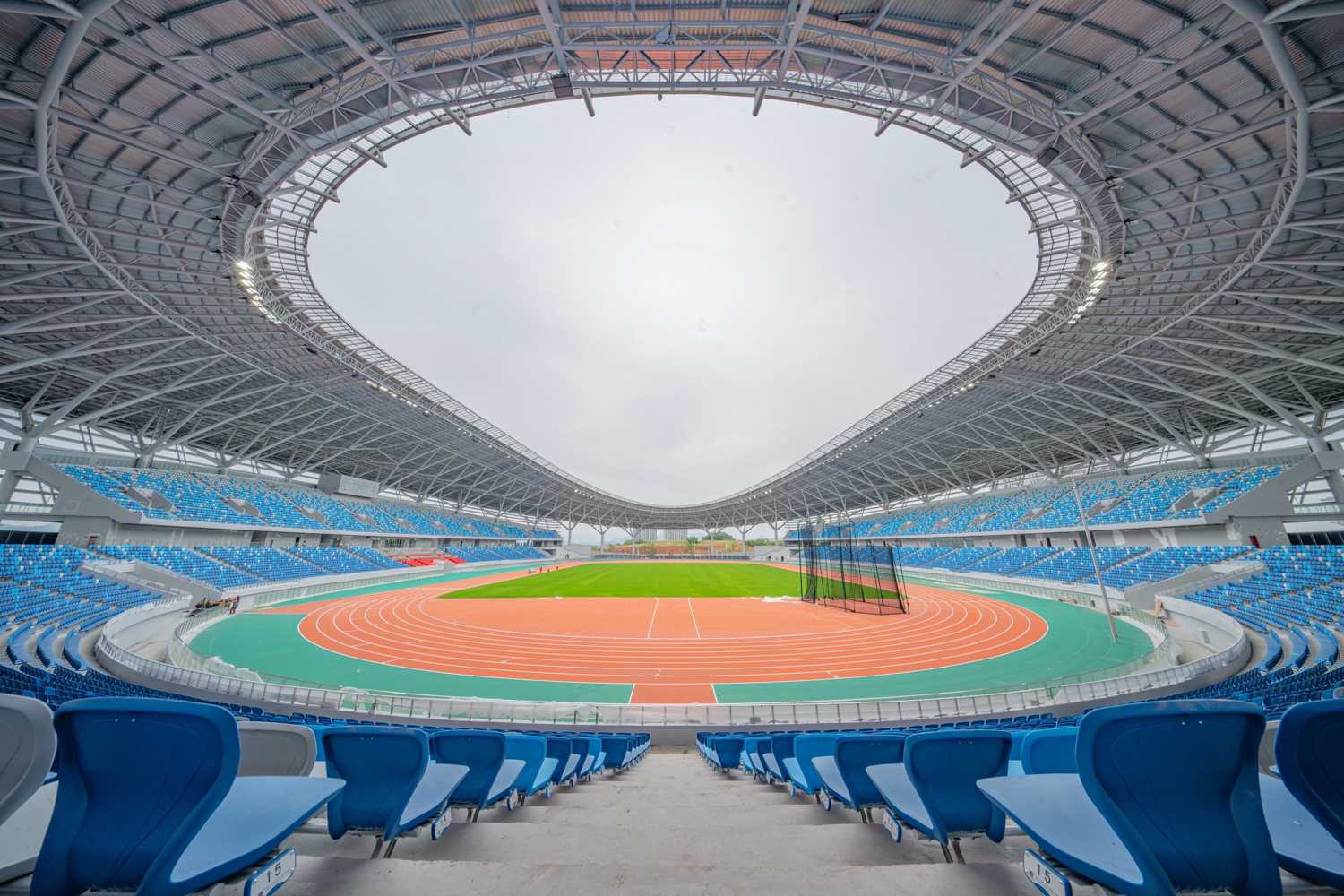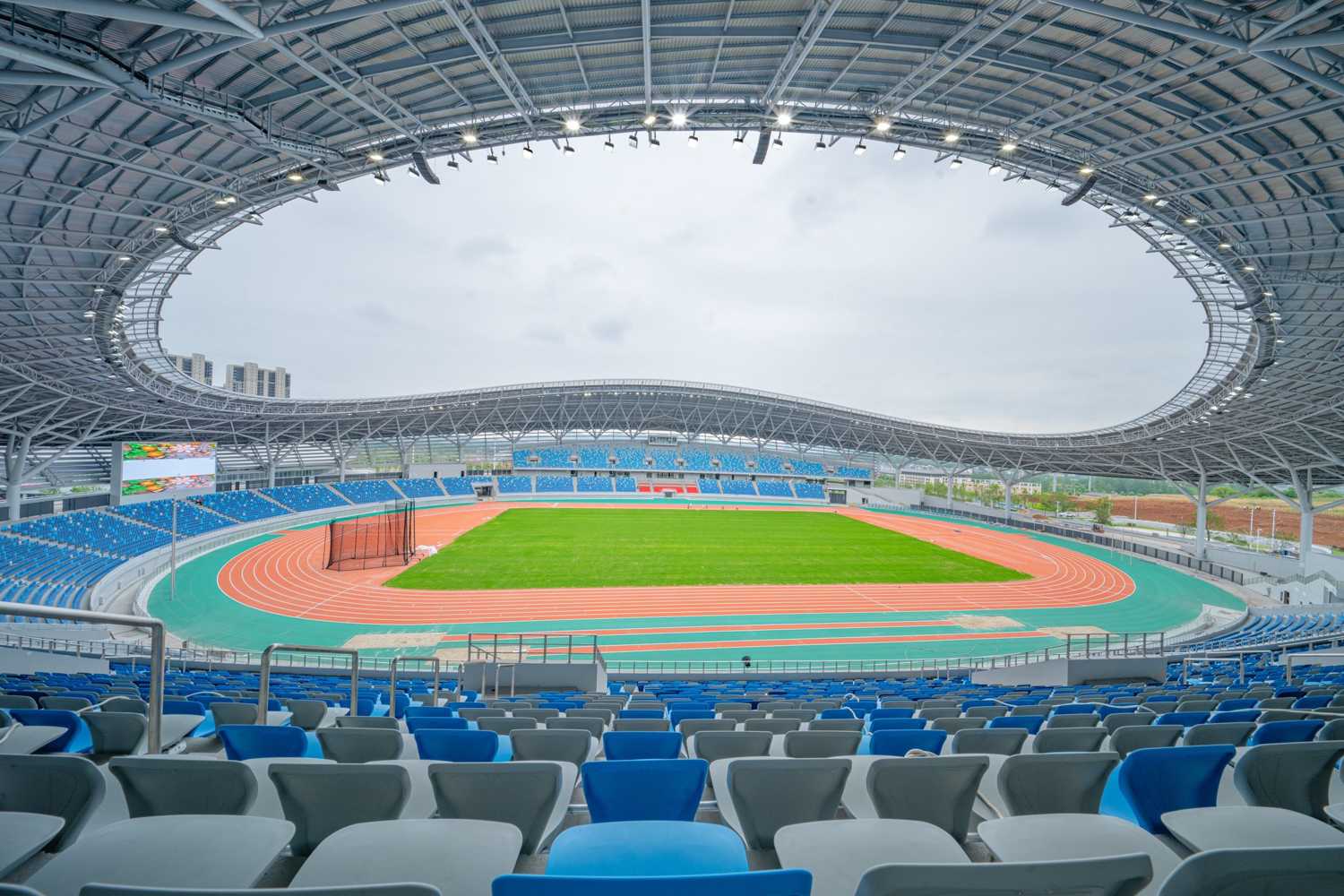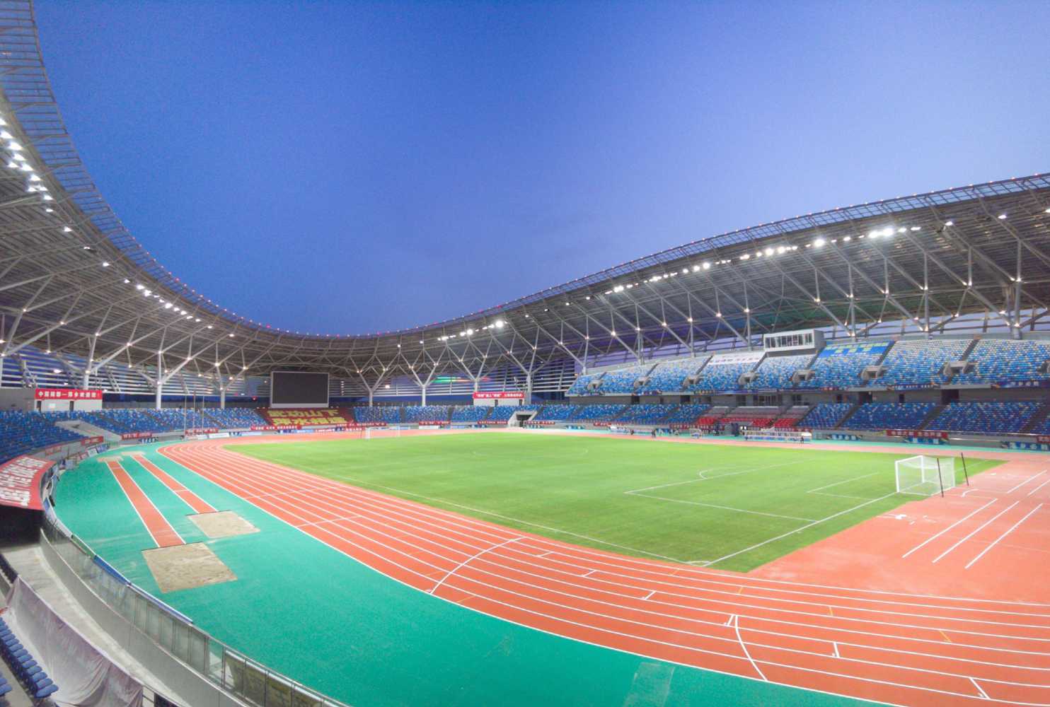 The main stadium at Pingxiang Olympic Sports Center is multi-functional and equipped with an athletics track. Three sides of the track are surrounded by oval stands, which along the straight sections are extended with a second tier, giving a total seating capacity of 22,000 spectators.