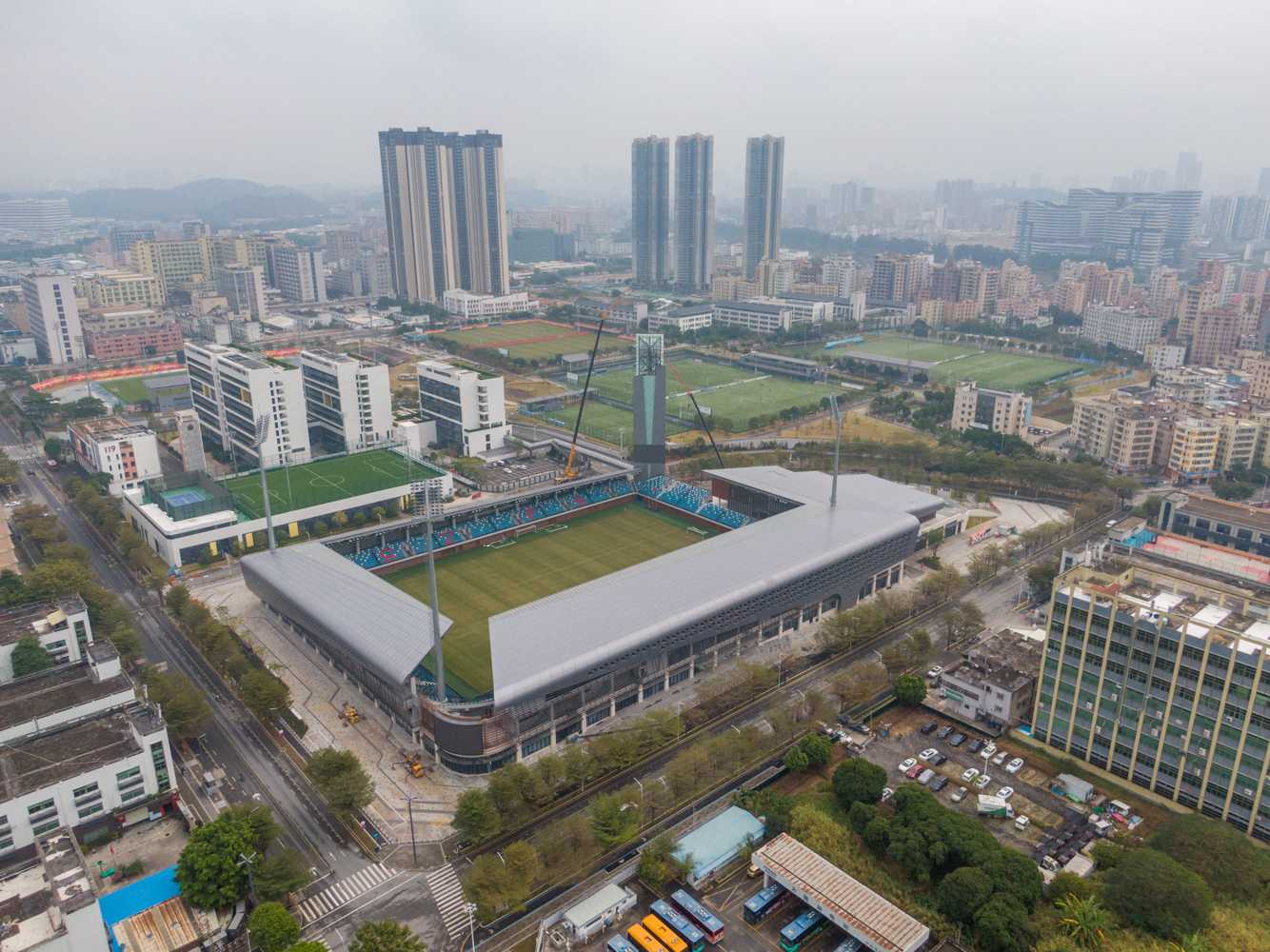 The modern football stadium in the Guangming district has a capacity of 10,000 spectators. The structure is covered with a metallic facade, a tall tower rises in one of its corners, and there is an underground parking garage beneath the pitch. The southern stand is also connected to a fitness center.