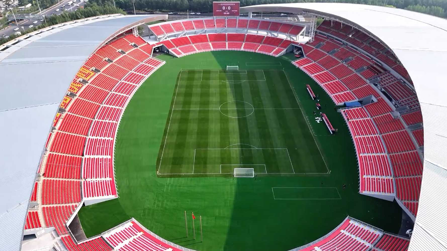 The largest stand, the main stand, is located on the west side. Both stands running along the sides of the pitch are covered by crescent-shaped roofs, and two large video screens are installed on the curved sections.