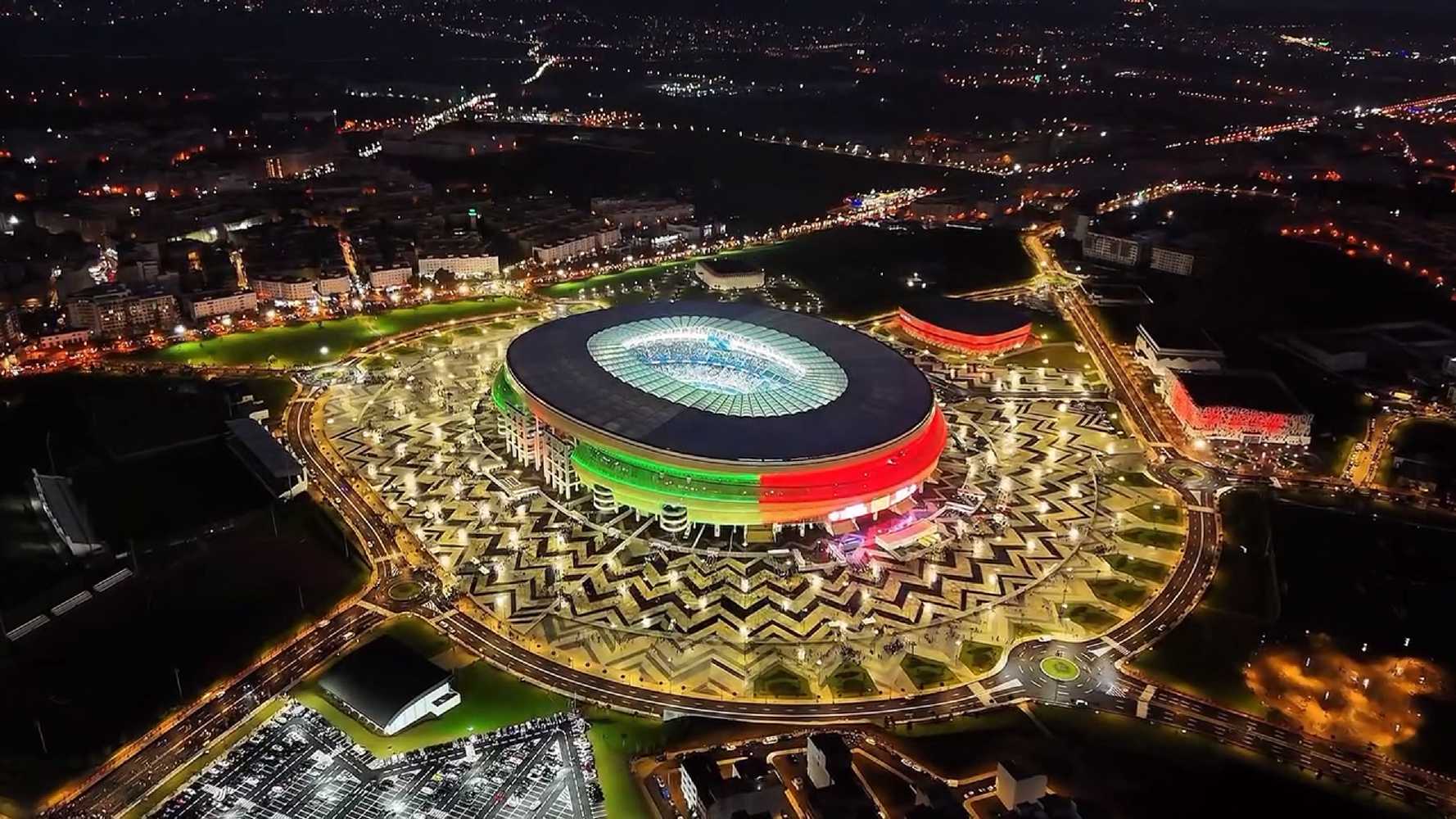 On the exterior, the stands are protected by a decorative facade, whose continuity is “interrupted” by three-dimensional reinforced concrete pillar-beam structures at the main entrances and spiral staircases. Large screens adorn the facade along the curves. At night, the stadium can be illuminated in different colors.